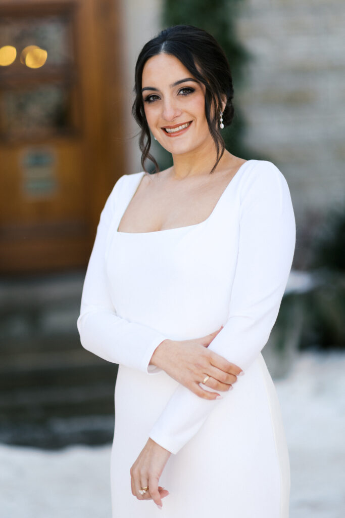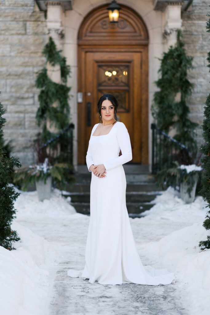 Although it was cold, we stepped outside for portraits with fresh snow on the ground. Winter weddings in Minnesota can be magical when embraced fully. Eliza looked stunning against the snowy backdrop, and the contrast of her elegant gown against the white landscape created beautiful, timeless imagery for a Minnesota bride.